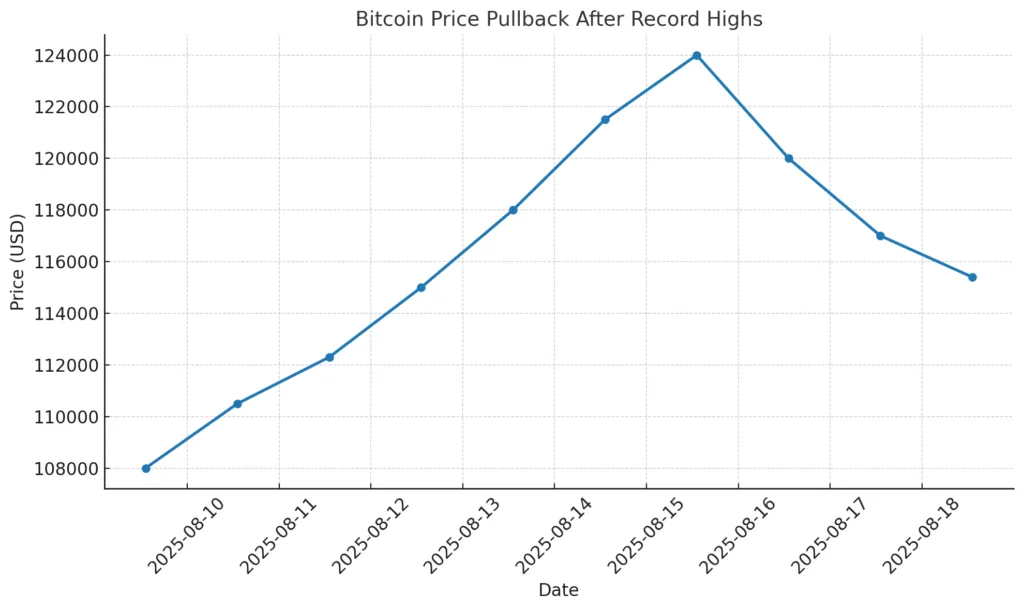Bitcoin was trading around $115,400 on Monday morning, down roughly 2.5% over the past 24 hours. This marks a notable pullback from last week, when the world’s largest cryptocurrency surged above $124,000, a new all-time high.