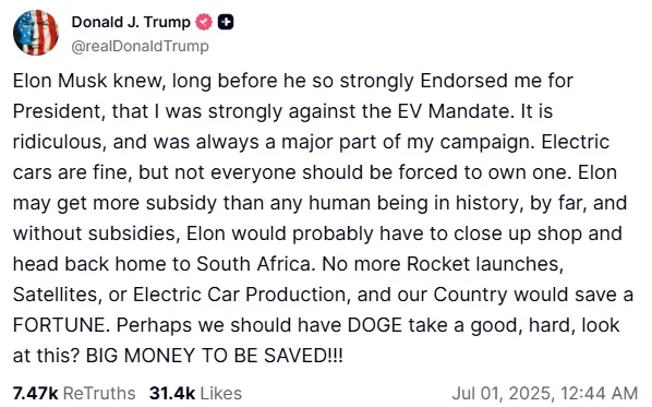 “Elon may get more subsidy than any human being in history, by far, and without subsidies, Elon would probably have to close up shop and head back home to South Africa. No more Rocket launches, Satellites, or Electric Car Production, and our Country would save a FORTUNE. Perhaps we should have DOGE take a good, hard, look at this? BIG MONEY TO BE SAVED!!!”