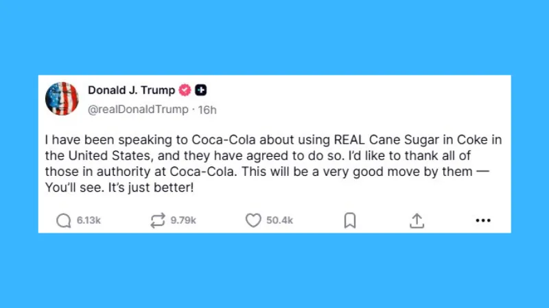 In a Truth Social post that rippled through commodity and food manufacturing markets, Trump declared, “I have been speaking to Coca-Cola about using REAL Cane Sugar in Coke in the United States, and they have agreed to do so. I’d like to thank all of those in authority at Coca-Cola. This will be a very good move by them — You’ll see. It’s just better!”
