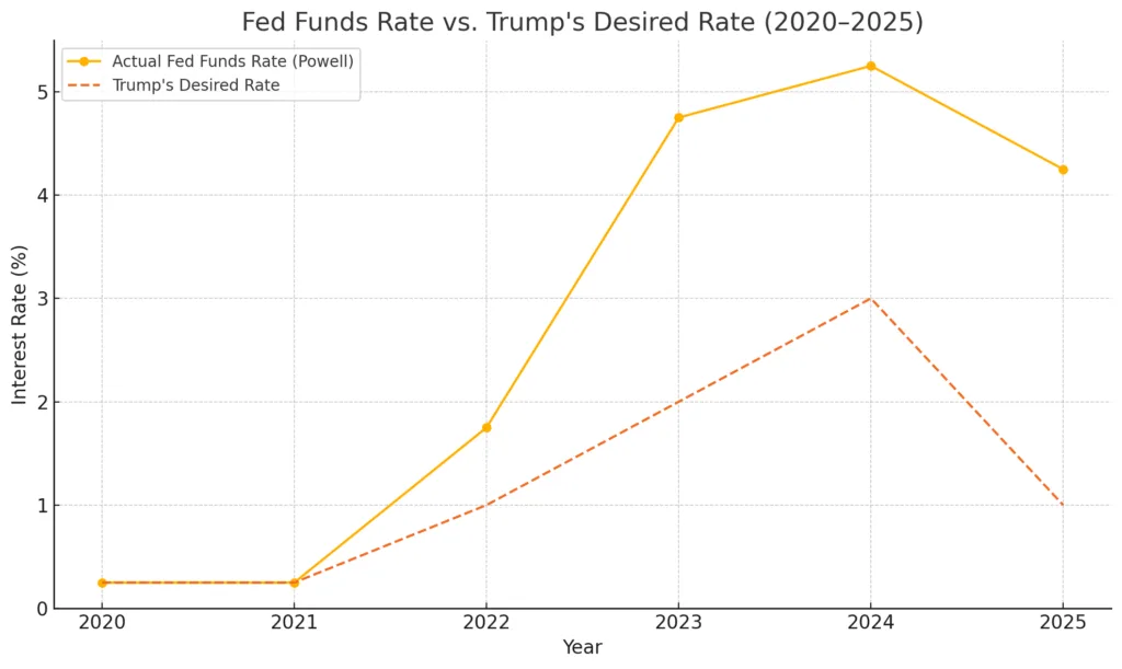 The chart below illustrates the divergence between the Fed’s actual interest rate path under Powell and Trump’s publicly expressed targets: